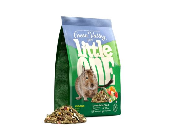 Little One корм из разнотравья "Зеленая долина" — корм для декоративных животных, в состав которого входит 60 разновидностей трав. Изготовленный с помощью специальной технологии холодного прессования, корм сохранил все витамины, минералы и другие ценные питательные вещества, входящие в состав растений. Корм богат длинными волокнами клетчатки, что обеспечит необходимый уход за зубами и правильное пищеварение у дегу.