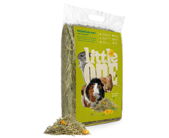 Горное сено с одуванчиком Little One — ароматное, очищенное и высушенное, собрано в экологически чистых горных районах и обогащено цветами одуванчика. Сено является основной составляющей рациона всех травоядных животных (кроликов, морских свинок, шиншилл, дегу), поэтому важно обеспечить его постоянное наличие в клетке.