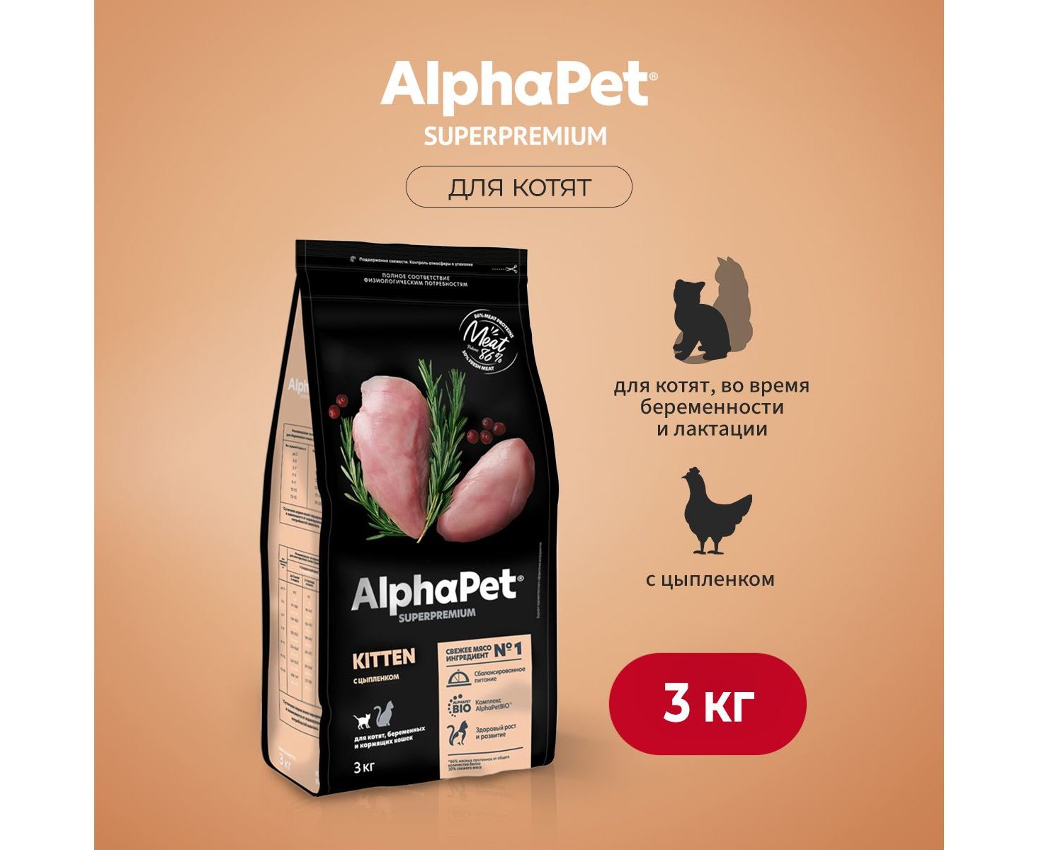 AlphaPet Superpremium корм для котят, беременных и кормящих кошек с цыпленком, 3кг, 650921