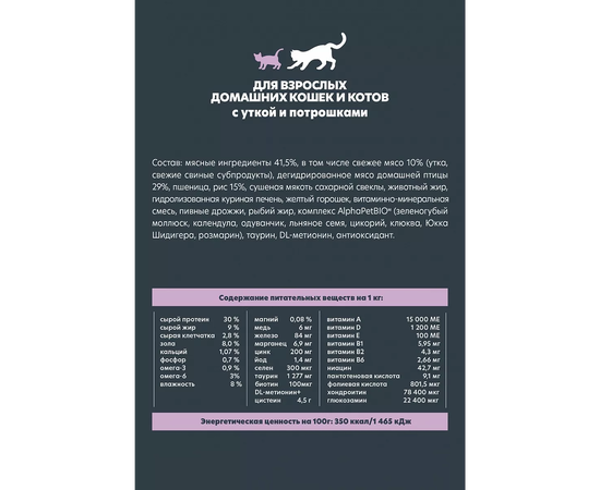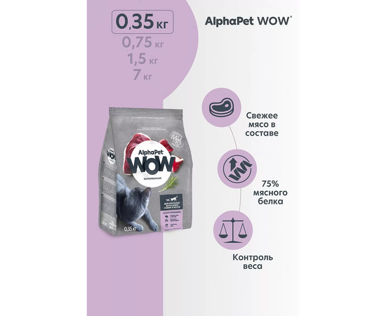 Сухой корм AlphaPet WOW для взрослых кошек, с уткой и потрошками, 0,35 кг