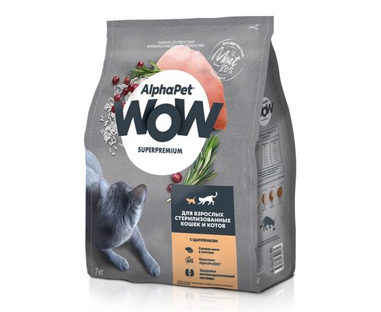 AlphaPet WOW для стерилизованных взрослых кошек с цыпленком сухой 7кг, 652062