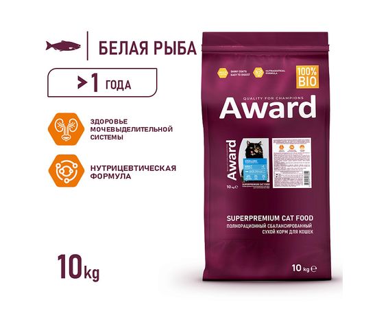 Сухой корм AWARD Sterilized для взрослых стерилизованных кошек, с белой рыбой, льном, клюквой и цикорием, 10кг