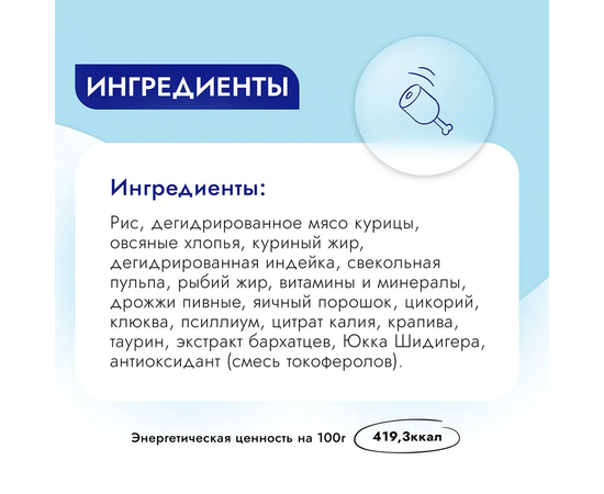 Рис, дегидрированное мясо курицы, овсяные хлопья, куриный жир, дегидрированная индейка, свекольная пульпа, рыбий жир, витамины и минералы, дрожжи пивные, яичный порошок, цикорий, клюква, псиллиум, цитрат калия, крапива, таурин, экстракт бархатцев, Юкка Шидигера, антиоксидант (смесь токоферолов).