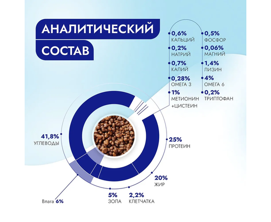 Аналитический состав: сырой протеин 25%, сырой жир 20%, сырая зола 5%, сырая клетчатка 2,2%, углеводы 41,8%, омега-3 жирные кислоты 0,28%, омега-6 жирные кислоты 4%, влага 6%. Витамины, на 1 кг: А 20 000 МЕ, D3 1800 МЕ, Е 300 мг, витамины группы В 2900 м