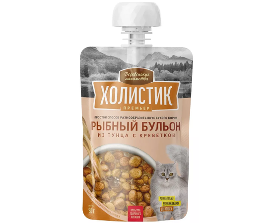 Влажный корм Деревенские Лакомства для кошек, Рыбный бульон из тунца с креветкой, 90г