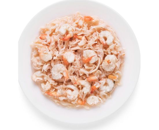 Без гормонов, антибиотиков, консервантов, красителей, ароматизаторов и других добавок. Состав: Куриная грудка (60%), Креветки (15%), Бульон (25%) Анализ: Аналитические составляющие: Белки 16%; Жиры 0,1%; Клетчатка 0,2%; Зола 1%; Влажность 82,7% Метаболическая энергия: 740 ккал/кг