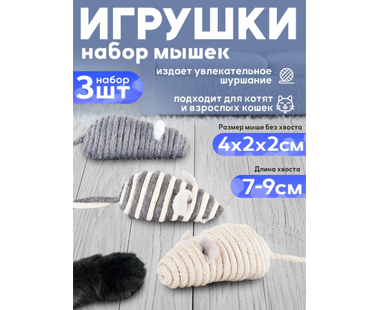DUVO+ Игрушка для кошек "Веревочные мышки", серо-бежевая, 14х2х2см 3шт/уп (Бельгия)