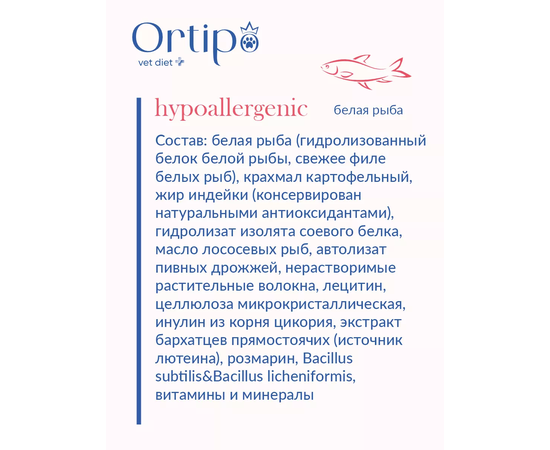 белая рыба (гидролизованный белок белой рыбы, свежее филе белых рыб), крахмал картофельный, жир индейки (консервирован натуральными антиоксидантами), гидролизат изолята соевого белка, масло лососевых рыб, автолизат пивных дрожжей, нерастворимые растительные волокна, лецитин, целлюлоза микрокристаллическая, инулин из корня цикория, экстракт бархатцев прямостоячих (источник лютеина), розмарин, Bacillussubtilis&Bacillus licheniformis, витамины и минералы