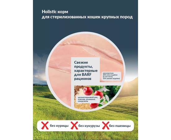 Состав: свежее и дегидрированное мясо индейки - мин 60% (в том числе: свежее филе грудки индейки - мин. 10%, свежие шеи индейки - мин. 10%, свежее мясо индейки - мин. 7%, свежие желудки индейки - мин. 6%, плазма крови - мин. 2%, дегидрированное мясо индейки - мин. 25%), цельнозерновой рис, растительные волокна (натуральный источник клетчатки), жир индейки (консервированный экстрактом розмарина и смешанными токоферолами), гидролизованные мясные белки (натуральная вкусоароматическая добавка), автолизат пивных дрожжей (натуральный источник пребиотиков MOS и бета-глюканов), целлюлоза микрокристаллическая, лецитин, инулин из корня цикория (натуральный источник пребиотиков FOS), DL-метионин, сушеные цветки ромашки, сушеный розмарин, сушеные плоды клюквы, спирулина (натуральный источник йода), пробиотики Bacillus subtilis&Bacillus licheniformis, таурин, витамины и минералы