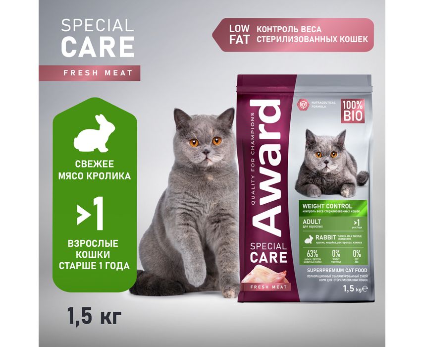 AWARD SPECIAL CARE Weight Control для взросл.стерил.кошек для контр.веса с кроликом 1.5 кг, 2548931