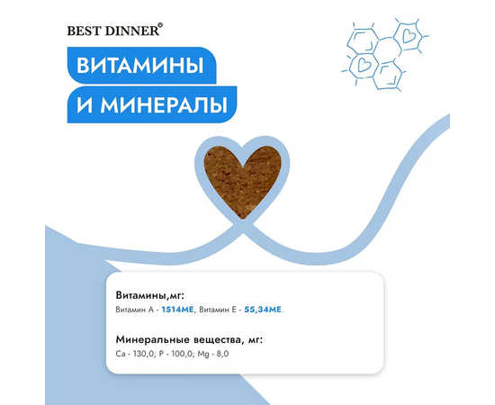 Добавки: Витамины, МЕ: А - 1514; Е - 55,34. Минеральные вещества, мг: Ca - 130,0; Р - 100,0; Mg - 5,0