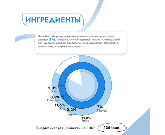 Состав: Индейка, субпродукты мясные и птичьи, плазма крови, крупа рисовая (3%), клетчатка, яичный порошок, масло льняное, рыбий жир, дрожжи, морские водоросли, юкка Шидигера, топинамбур, семена льна, желирующая добавка.