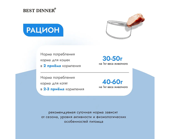 Суточная норма: Суточная норма для кошек: 30 - 50 г, для котят 40-60 г на кг веса животного в 2 - 3 приема кормления.