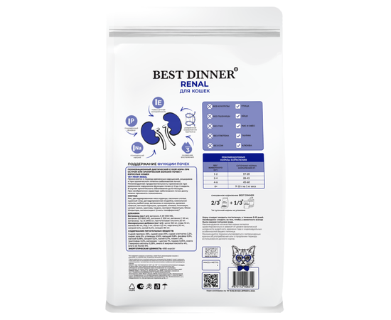 Полнорационный диетический сухой корм для взрослых кошек предназначенный для поддержания функции почек при острых или хронических почечных заболеваниях. Применяется в период временных нарушений, рецидивов и при хроническом течении заболевания почек. Рекомендуемая продолжительность применения при временном нарушении функции почек от 2 до 4 недель. В случае хронического заболевания до 6 месяцев. При необратимом характере заболевания почек диету можно применять пожизненно. Рекомендуется проконсультироваться с ветеринарным врачом об употреблении или о продлении периода использования данного корма. Вода должна быть в доступна кошке в любое время.