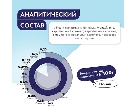 Мясо и субпродукты (ягнёнок, курица), рис, картофельный крахмал, картофельные волокна, витаминно-минеральный комплекс, лососевое масло, таурин.