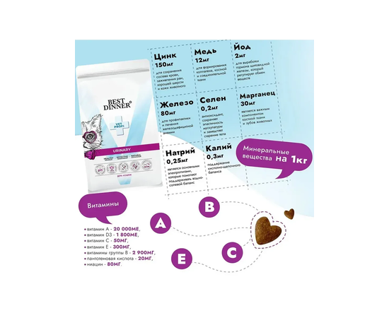 Сухой корм Best Dinner Vet Profi Urinary для кошек, полнорационный, диетический при струвитном уролитиазе с поддержанием здоровья мочевыводящих путей Полнорационный диетический cухой корм для кошек при струвитном уролитиазе с поддержанием здоровья мочевыводящих путей.