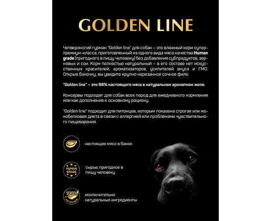 Четвероногий гурман “Golden line” для кошек – это влажный корм суперпремиум класса, приготовленный из одного вида мяса качества Human grade (пригодного в пищу человеку) без добавления субпродуктов, зерновых и сои. Корм полностью натуральный – в его составе нет искусственных красителей, ароматизаторов, усилителей вкуса и ГМО.