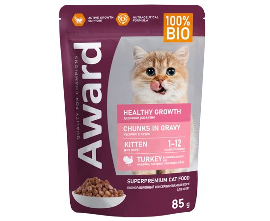 Влажный корм Award Healthy growth для котят от 1 месяца, кусочки в соусе с индейкой, 85г