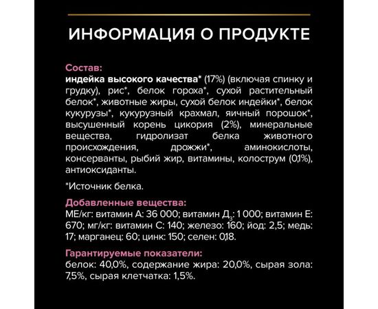 Состав: индейка (17%**), рис**, сухой белок индейки**, концентрат белка гороха**, животный жир, соевый белок**, кукурузный глютен**, кукурузный крахмал, высушенный корень цикория (2%*), минеральные вещества, вкусоароматическая кормовая добавка, дрожжи**, аминокислоты, витамины, рыбий жир, консерванты, антиоксиданты.