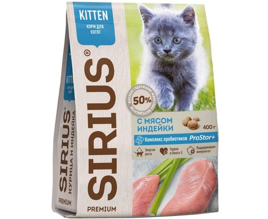SIRIUS — сухой корм премиум класса для полноценного ежедневного рациона котят с 1-2-х месяцев до 1 года. Высокое содержание мясных ингредиентов обеспечивает оптимальный уровень белка и укрепляет мышцы. Баланс витаминов и комплекса пробиотиков 4-го поколения PROSTOR+ нормализует пищеварение и укрепляет иммунитет. Омега 3 и Омега 6 способствуют поддержанию здоровья сердца, мозга, нервной системы, здоровья кожи и красоты шерсти. Специально подобранный размер гранулы для котят.