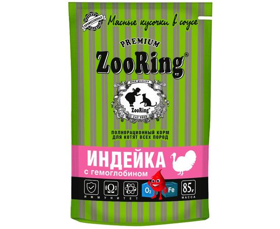 Влажный корм ZooRing для котят, сочные кусочки в соусе индейка с гемоглобином,85гр
