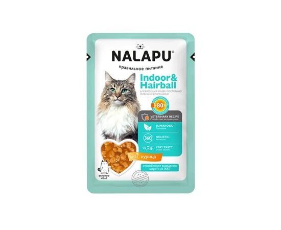 Влажный корм NaLapu Indoor&Hairball для взрослых кошек постоянно живущих в помещении, сочные кусочки с курицей в желе, 77г