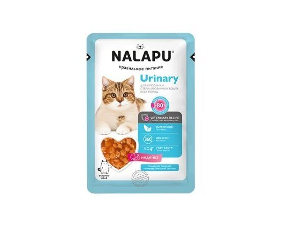Корм NaLapu Urinari для взрослых здоровых, стерилизованных, пожилых кошек, сочные кусочки с мясом индейки в желе, 77г