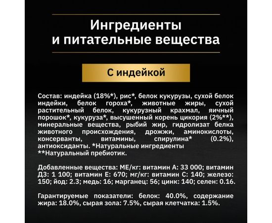 Индейка* (18%), белок кукурузы, сухой белок индейки, белок гороха*, животные жиры, сухой растительный белок, кукурузный крахмал, яичный порошок*, кукуруза*, высушенный корень цикория** (2%), минеральные вещества, рыбий жир, гидролизат белка животного происхождения, дрожжи, аминокислоты, консерванты, витамины, спирулина* (0.2%), антиоксиданты.