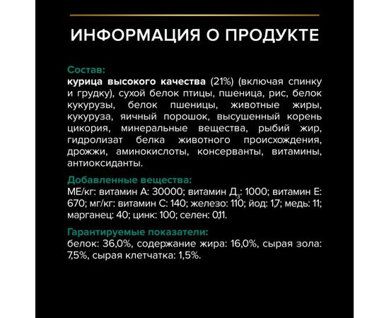 Корм PRO PLAN® содержит особую, разработанную с участием ученых комбинацию ингредиентов для поддержания здоровья кошек в течение продолжительного времени. Корм PRO PLAN® для взрослых кошек сочетает все необходимые питательные вещества, включая витамины А, С, Е, а также Омега-3, Омега-6 жирные кислоты и натуральный пребиотик.