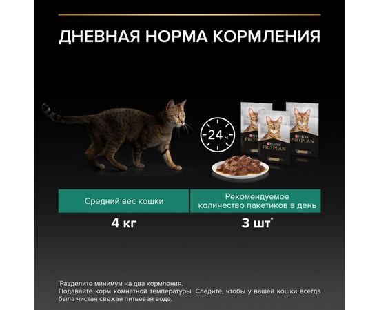 Для взрослой кошки среднего веса (4 кг) требуется 4 пакетика в день, разделенных на два кормления. Следите, чтобы у вашей кошки всегда была чистая, свежая питьевая вода.