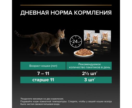 Для взрослой кошки среднего веса (4 кг) требуется 3 пакетика в день, разделенных на два кормления. Следите, что бы у Вашей кошки была всегда чистая, свежая питьевая вода