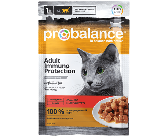 ProBalance® Immuno Рrotection с говядиной в соусе предназначен для ежедневного кормления взрослых кошек всех пород. Природные антиоксиданты, содержащиеся в кусочках, способствуют укреплению иммунитета. Специально подобранный пребиотик поддерживает здоровую микрофлору кишечника.