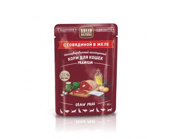 Влажный корм Solid Natura Premium для кошек, кусочки в желе с говядиной, 0,085 кг
