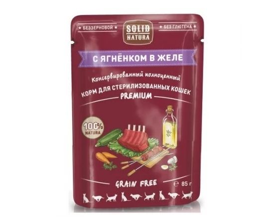Влажный корм Solid Natura Premium для кошек, кусочки в желе с ягненком, 0,085 кг