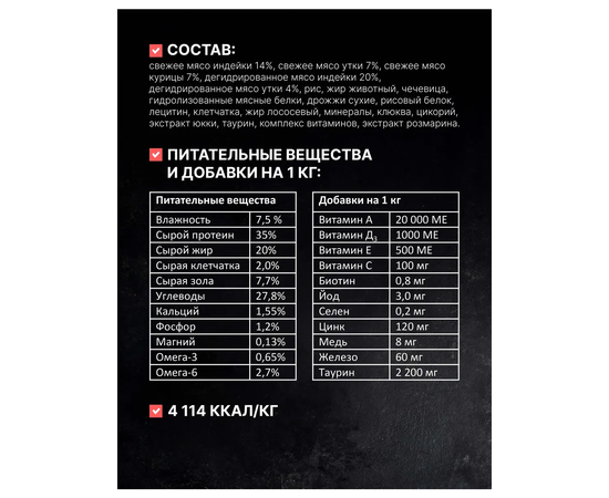 Состав: свежее мясо индейки 14%, свежее мясо утки 7%, свежее мясо курицы 7%, дегидрированное мясо индейки 20%, дегидрированное мясо утки 4%, рис, жир животный, чечевица, гидролизованные мясные белки, дрожжи сухие, рисовый белок, лецитин, клетчатка, жир лососевый, минералы, клюква, цикорий, экстракт юкки, таурин, комплекс витаминов, экстракт розмарина.