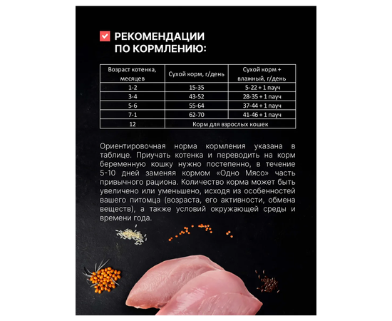 Свежее мясо содержит все незаменимые аминокислоты, необходимые для здоровья питомцев, натуральные белки из свежего мяса легче усваиваются организмом животных, способствуя росту и поддержанию мышечной массы. Привлекательность вкуса: свежие мясные ингредиенты улучшают вкус и аромат корма, делая его более привлекательным для кошек Приучать котенка и переводить на корм беременную кошку нужно постепенно, в течении 5-10 заменяя кормом ОДНО МЯСО часть привычного рациона. Количество корма может быть увеличено или уменьшено, исходя из особенностей вашего питомца (возраста, его активности, обмена веществ), а также условий окружающей среды и времени года.