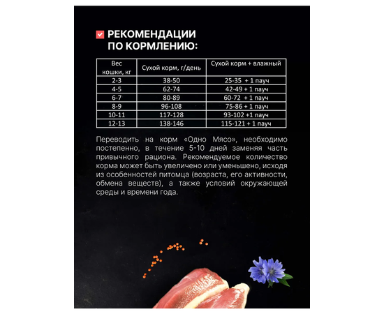 Переводить на корм «Одно Мясо», необходимо постепенно в течение 5-10 дней, заменяя часть привычного рациона. Рекомендуемое количество корма может быть увеличено или уменьшено, исходя из особенностей вашего питомца (возраста, его активности, обмена веществ), а также условий окружающей среды и времени года.