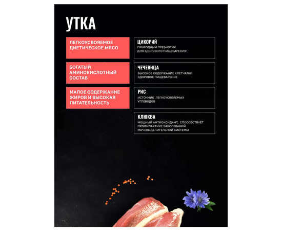 Состав: свежее мясо утки 20%, свежее мясо индейки 7%, свежее мясо курицы 7%, дегидрированное мясо курицы 18 %, чечевица, рис, жир животный, гидролизованные мясные белки, солодовый протеин, рисовый белок, лецитин, клетчатка, жир лососевый, минералы, DL-метионин, клюква, цикорий, экстракт юкки, таурин, комплекс витаминов, экстракт розмарина. Добавки на 1 кг: витамин А – 20 000 МЕ, витамин D3 – 900 МЕ, витамин Е – 400 МЕ, витамин С – 100 мг, биотин – 0,8 мг, йод – 3,0 мг, селен – 0,2 мг, цинк – 100 мг, медь – 8 мг, железо – 60 мг, таурин – 2 200 мг. Энергетическая ценность: 3 784 ккал/кг