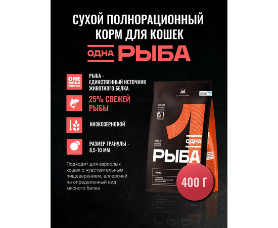 Выбирая Одно Мясо 400 гр сухой корм для взрослых кошек с рыбой, вы обеспечиваете своему питомцу здоровое и сбалансированное питание, способствующее его активному образу жизни и долголетию.