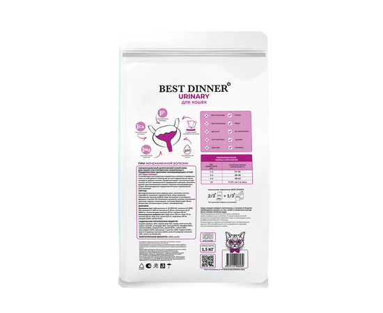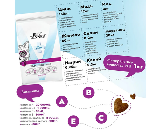 Корм кошачий Бест Диннер VET PROFI Уринари обогащен всеми необходимыми витаминами и минералами, которые не только легко усваиваются, но и укрепляют иммунитет, улучшают состояние шерсти и общую физическую форму кошки.