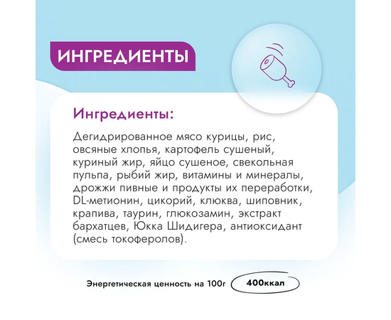 Дегидрированное мясо курицы, рис, овсяные хлопья, картофель сушеный, куриный жир, яйцо сушёное, свекольная пульпа, рыбий жир, витамины и минералы, дрожжи пивные и продукты их переработки, DL-метионин, цикорий, клюква, шиповник, крапива, таурин, глюкозамин, экстракт бархатцев, Юкка Шидигера, антиоксидант (смесь токоферолов).