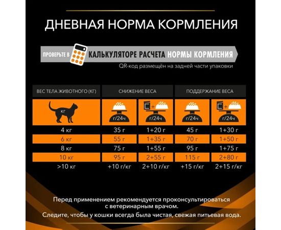 Предлагаемый режим кормления основан на расчетах с использованием таких показателей, как вес кошки, и желаемое снижение веса на 1 % в неделю. Необходимо пересчитывать суточную норму каждые 4 недели. Корм применяется до достижения желаемой массы тела