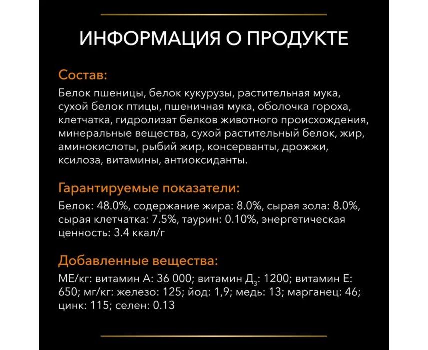 Кукурузная глютеновая мука, пшеничная глютеновая мука, соевая мука, обезвоженный куриный яичный белок, пшеничная мука, гороховая клетчатка, гидролизат, животный жир, рыбий жир, дрожжи, минералы.
