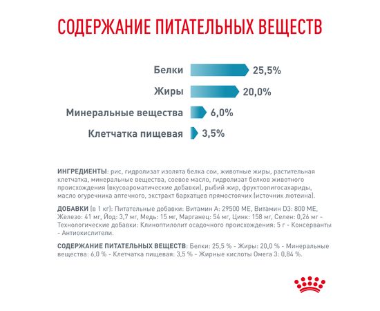 Злаки, гидролизат изолята белка сои, животные жиры,растительная клетчатка, минеральные вещества, соевое масло, гидролизат белков животного происхождения (вкусоароматические добавки), рыбий жир, фруктоолигосахариды, масло огуречника аптечного, экстракт бархатцев прямостоячих (источник лютеина).