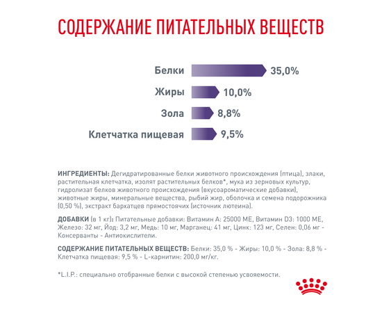 дегидратированные белки животного происхождения (птица), кукуруза, растительная клетчатка, пшеница, кукурузная клейковина, пшеничная клейковина*, гидролизат белков животного происхождения, животные жиры, минеральные вещества, экстракт цикория, оболочка и семена подорожника, рыбий жир, экстракт бархатцев прямостоячих (источник лютеина).