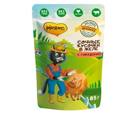 Мнямс сочные кусочки для кошек в желе с говядиной Фермерская ярмарка линия Кот Федор 85 г, 170470
