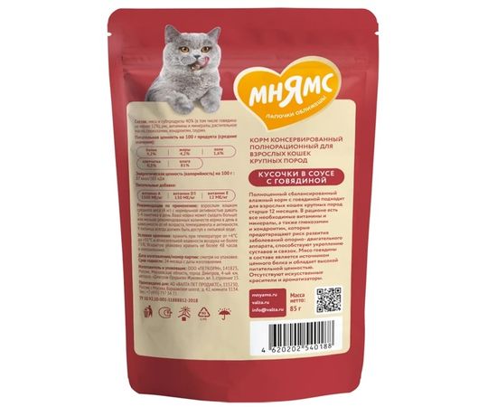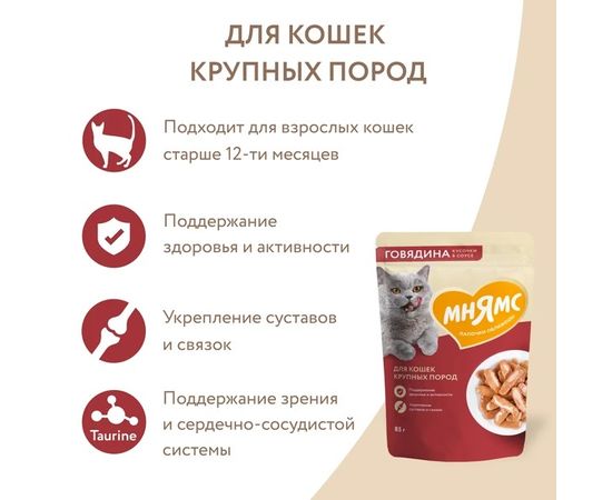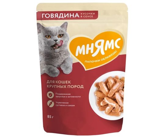 Мнямс влажный корм кусочки в соусе с говядиной для крупных кошек,85г,540188