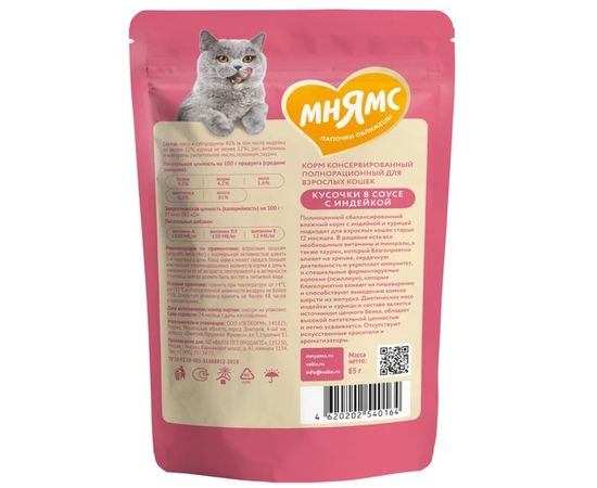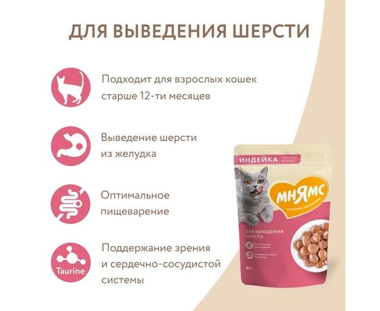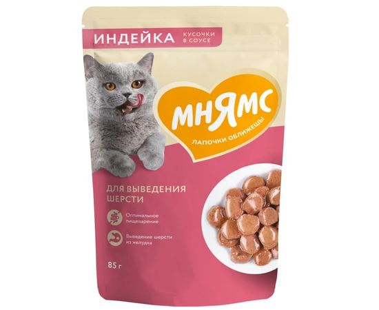 Мнямс влажный корм кусочки в соусе с индейкой для выведения шерсти у кошек, 85г,540164