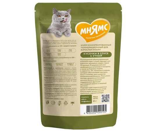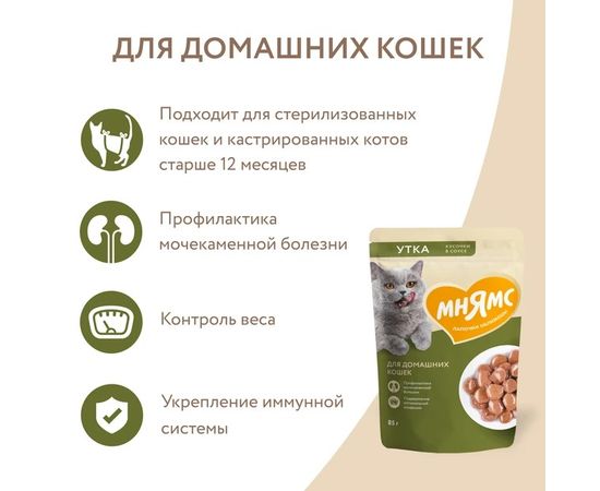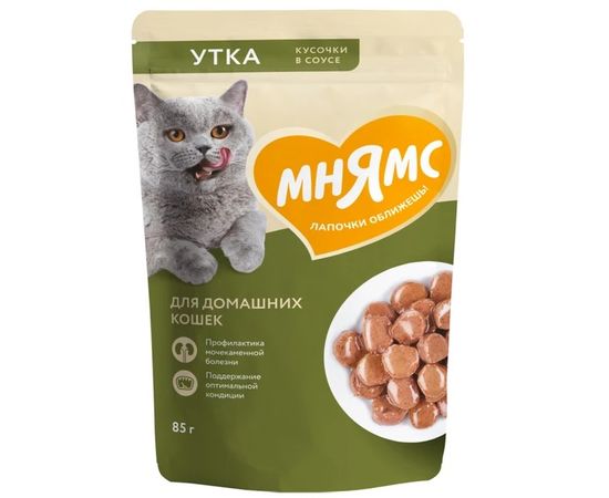 Мнямс влажный корм кусочки в соусе с уткой для домашних кошек, 85г,540195