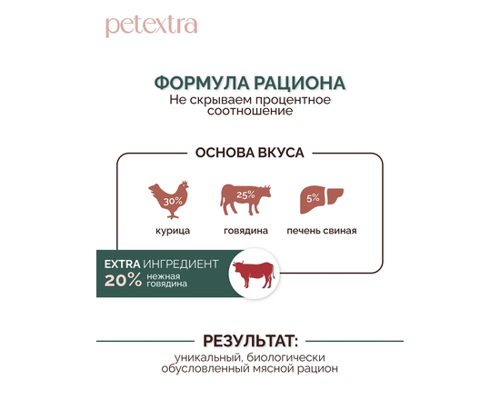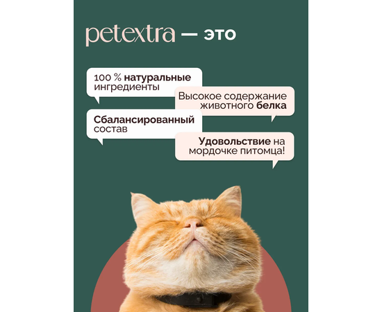 PETEXTRA - это качественное питание, которое полностью удовлетворит потребности вашего любимца. Изготовлен из 100% натуральных ингредиентов, включая мясо, субпродукты, витамины и микроэлементы, он предлагает полный комплекс питательных веществ для поддержания здоровья и благополучия вашего кота.
